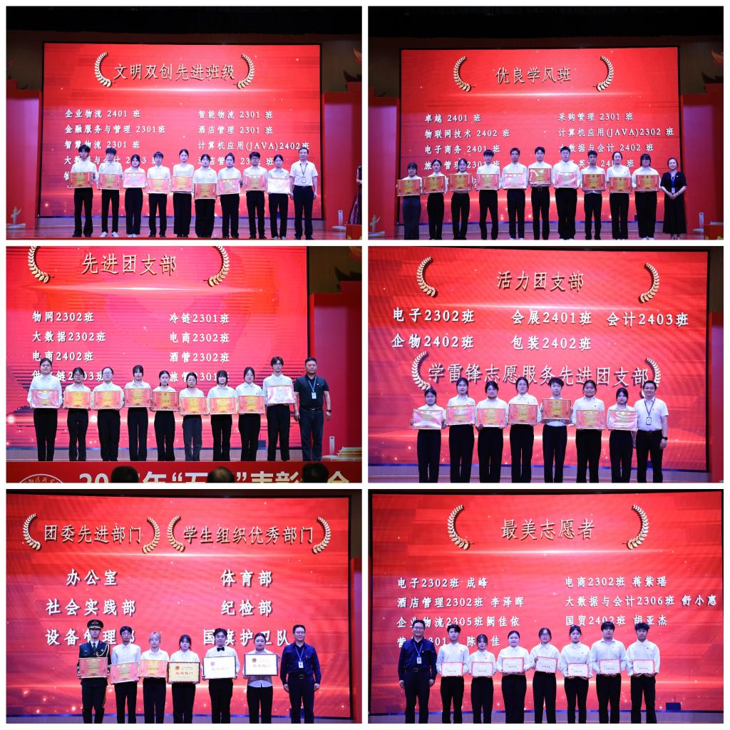 大会分三轮颁奖表彰了文明双创先进班级、优良学风班、先进团支部、活力团支部、学雷锋志愿服务先进团支部、团委先进部门、学生组织优秀部门、最美志愿者、优秀社团指导老师、优秀教师团干、优良学风院、文明双创先进班级、先进团总支等先进集体及个人。大会表演节目精彩纷呈,由赵思惠、徐建、何莉洋、李鑫四位老师带来的歌曲《五四特别版错位时空》以悠扬歌声串联起百年青春记忆;朗诵《青春潇湘》则以激昂的文字,深刻描绘了我校青年的蓬勃活力与使命担当。街舞协会的舞蹈《炙热的回响》通过强劲的节奏与富有张力的肢体语言,展现红色革命薪火在新时代的炽热传承。大会在大合唱《再一次出发》的激昂旋律中圆满落幕。