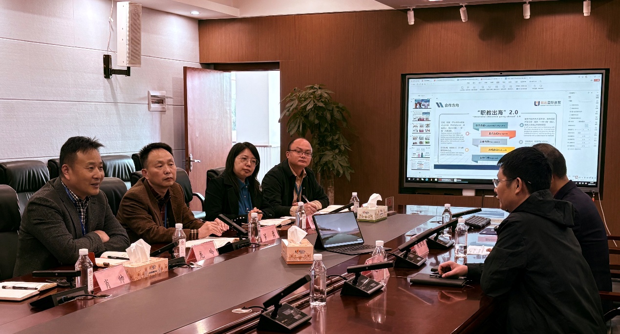 罗勇首先对两家合作企业的到来表示欢迎,并简要介绍了学校概况及与会人员。随后,国际物流学院副院长姚济国就有关双高校国际合作与交流相关建设任务做了介绍。赵晓华和周晋分别介绍了公司的相关情况以及在职教出海方面做出的成果。在自由交流环节,与会人员围绕专业标准出海、课程标准出海、国际化师资培训、留学生招收、“中文+职业技能”培训、国际会议组织等具体内容展开了深入讨论。