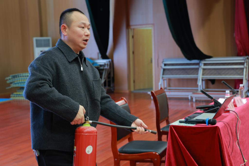 在消防安全防控培训环节,罗老师围绕“黄金三分钟”初期火灾扑救原则展开详细解读,强调在火灾初期及时处置对控制火势蔓延的关键作用。随后,他在现场亲自演示了灭火器“提、拔、握、压”的正确操作步骤,通过慢动作分解与易错点提醒,确保每一位参训人员都能清晰理解操作要领。此外,罗老师还系统讲授了“五要素报警法”,即报警时需准确报告火灾发生的详细地址、火势大小、燃烧物质种类、有无被困人员及报警人联系方式,帮助师生掌握在紧急情况下保持冷静、科学应对的方法。针对校园高层建筑较多的特点,他还重点讲解了高层建筑疏散逃生技巧及防烟自救方法,包括湿毛巾捂鼻、低姿前行、避开电梯选择疏散楼梯等实用技能,全面提升参训人员的应急避险能力。