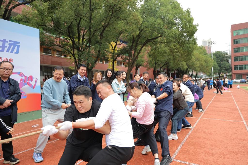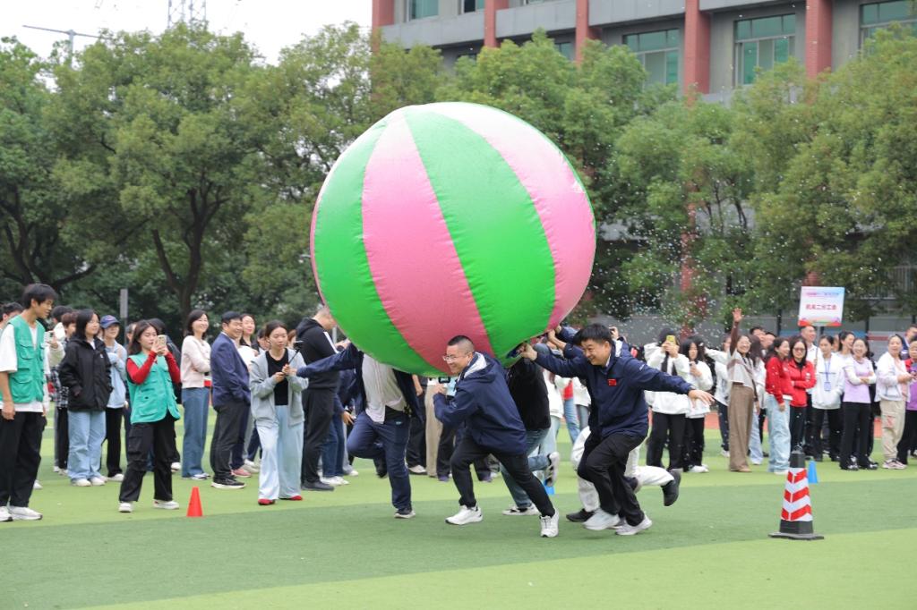 比赛现场气氛热烈,教职工热情高涨。在“鸿运彩球”项目中,队员们需要默契配合,共同控制彩球的移动方向;在“趣味接力”环节,参赛选手既要保证速度,又要完成你画我猜、指压板跳绳等规定动作;而传统的“拔河比赛”更是将现场气氛推向高潮,加油声、呐喊声此起彼伏;“环环相扣”项目则考验队员们的协调性和配合度。各参赛队伍团结协作、奋勇争先,展现了教职工们积极向上的精神风貌。