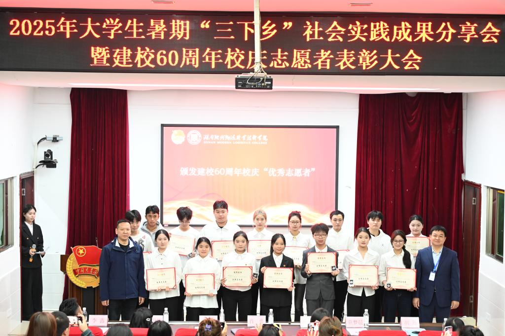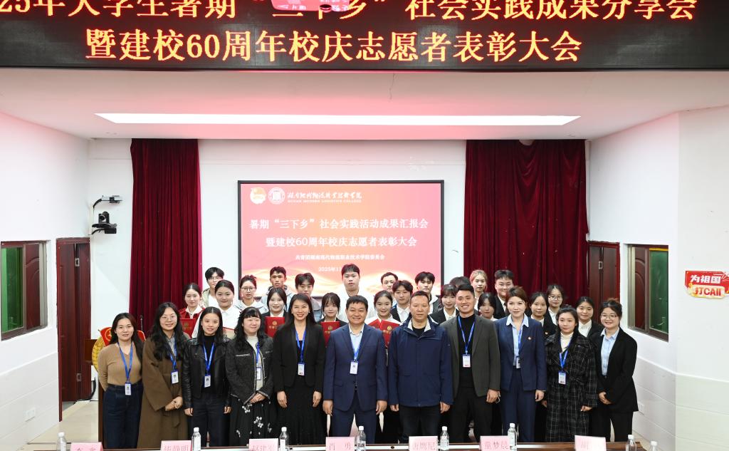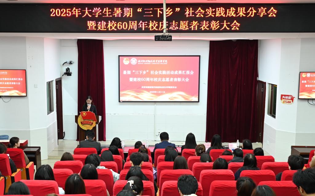 11月11日,我校2025年暑期“三下乡”社会实践成果分享会暨建校60周年校庆志愿者表彰大会在图书馆一楼学术报告厅圆满举行。校党委委员、副校长肖勇出席大会并讲话,学生工作部部长赵建军,校团委副书记唐鹰尼,校团委兼职副书记毕静明、童梦晨,各二级院团总支书记、校团委干事李鑫、胡筠,通识学院老师蔡萱,“三下乡”实践团队成员,校庆志愿者及各二级院学生代表等齐聚现场,共话实践收获,弘扬志愿精神。