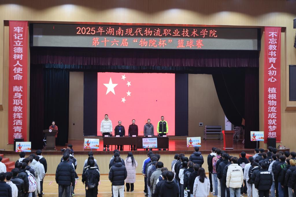 开幕式在雄壮的国歌声中拉开序幕。全场师生肃立高唱国歌,鲜艳的五星红旗冉冉升起,澎湃的家国情怀与青年使命感在场馆内激荡。主持人蔡萱老师介绍,本届赛事为期10天,设置男子组、女子组双赛道,共有13支队伍、28场精彩对决,将通过激烈角逐决出桂冠。作为学校落实“五育并举”育人方针的重要载体,“物院杯”篮球赛已连续举办十六届,既是校园文化生活的“活力名片”,更是锤炼学子意志品质、培养“德技并修、全面发展”的高素质物流人才的实践平台。