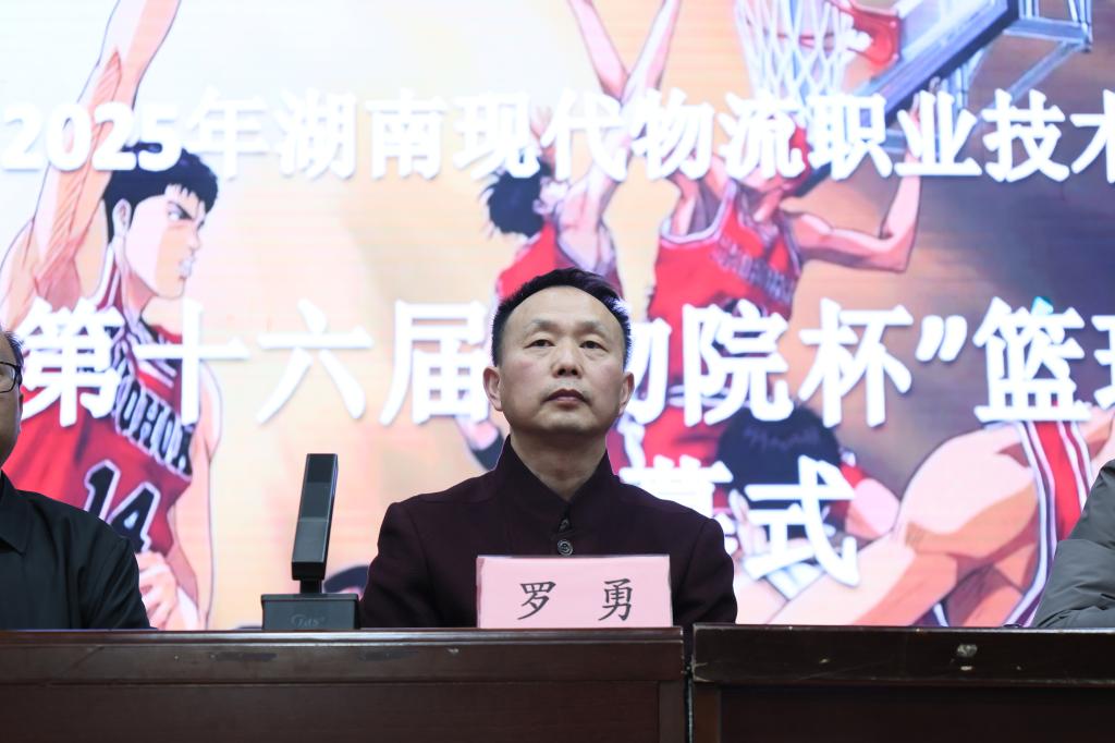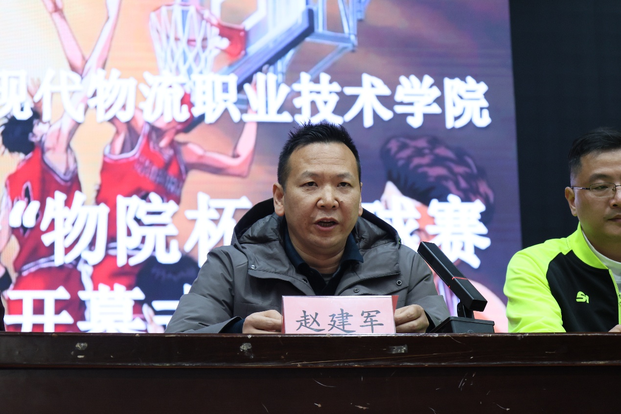 “我代表全体裁判员承诺,严格执裁、公平公正,守护每一份拼搏的热血!”“我代表全体运动员宣誓,遵守规则、团结协作,赛出物流学子的风采!”裁判员代表余博老师与运动员代表田金保的誓言掷地有声,传递出对体育精神的坚守。赵建军在致辞中深刻阐释赛事意义,“学校始终将体育作为立德树人的关键抓手,通过'物院杯'等品牌赛事构建'以体育德、以体增智、以体强志'的育人体系。”他指出,篮球赛不仅是技巧的较量,更是意志的磨砺——每一次传球是协作的考验,每一次防守是毅力的锤炼,希望全体运动员以赛场为课堂,将“团结协作、永不言弃”的体育精神融入学习生活,让青春的激情与毅力转化为成长的动力,真正诠释新时代青年的责任担当。