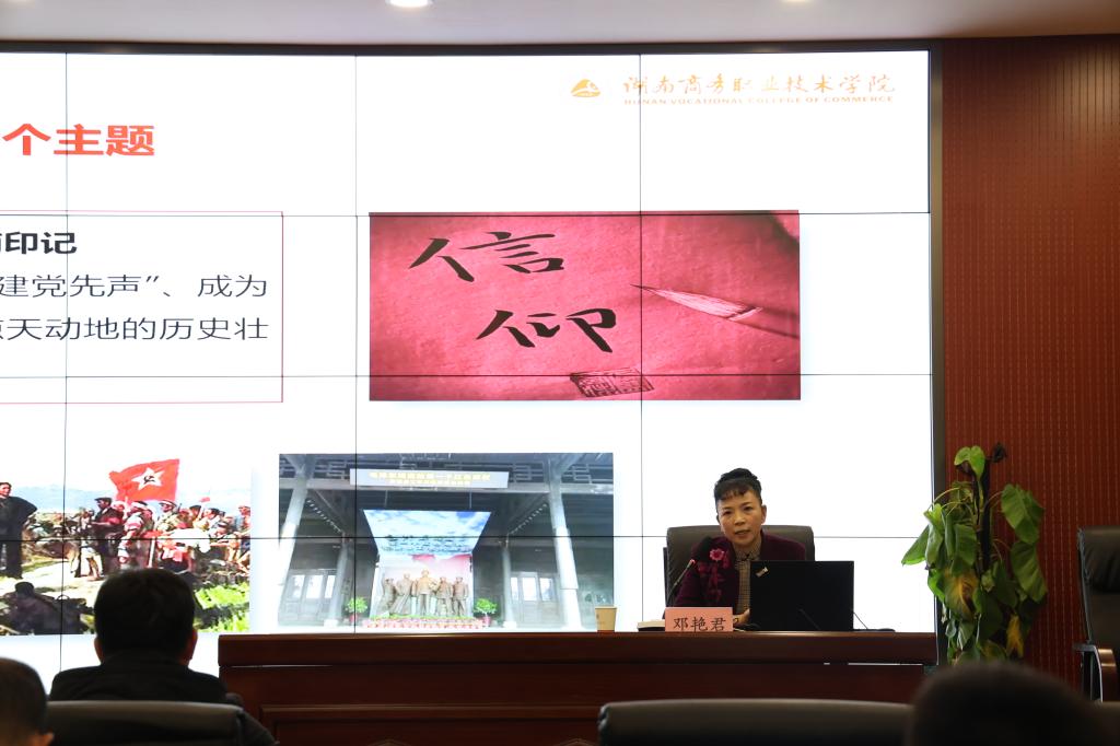 为深入学习贯彻党的二十届四中全会精神,12月16日,我校举办了“中国共产党人精神谱系”专题宣讲活动。此次活动特邀湖南商务职业技术学院马克思主义学院院长邓艳君教授担任主讲,为师生们带来一场题为《中国共产党人信仰之歌的湖湘乐章》的精彩宣讲。学校党委班子成员、全体教师党员及学生党员代表300余人齐聚一堂,共赴这场思想盛宴。