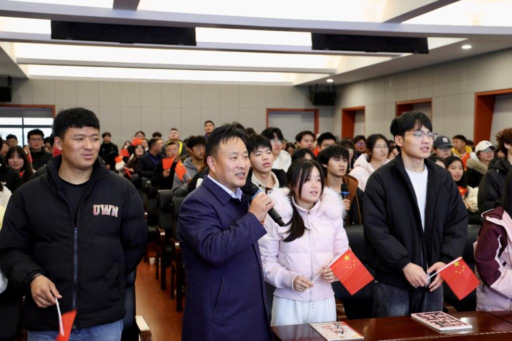 “一首校歌,就是一所学校的精神密码;一段旋律,承载着六十年的办学积淀。”课堂上,旋律与初心共鸣,校史与使命交融,让物院学子在歌声中感悟校魂、在分享中明晰方向。龙吟以学校60周年校庆主题曲《物院花开》为切入点,详细解读了歌曲的创作背景与深刻内涵。从“甲子校庆的文化表达”到“物流特色的艺术呈现”,从“明德、崇技、笃行、砺志”的校训融入“花开万里,歌彻潇湘”的磅礴气势,他通过逐句赏析,引导学生在优美旋律中重温学校“立足物流、特色办学”的辉煌历程,感受一代代物院人“敢为人先”的精神品格。随后,在龙吟的带领下,全场齐声合唱《物院花开》,激昂的歌声回荡在会场,将对学校的热爱与自豪传递到每个角落。
