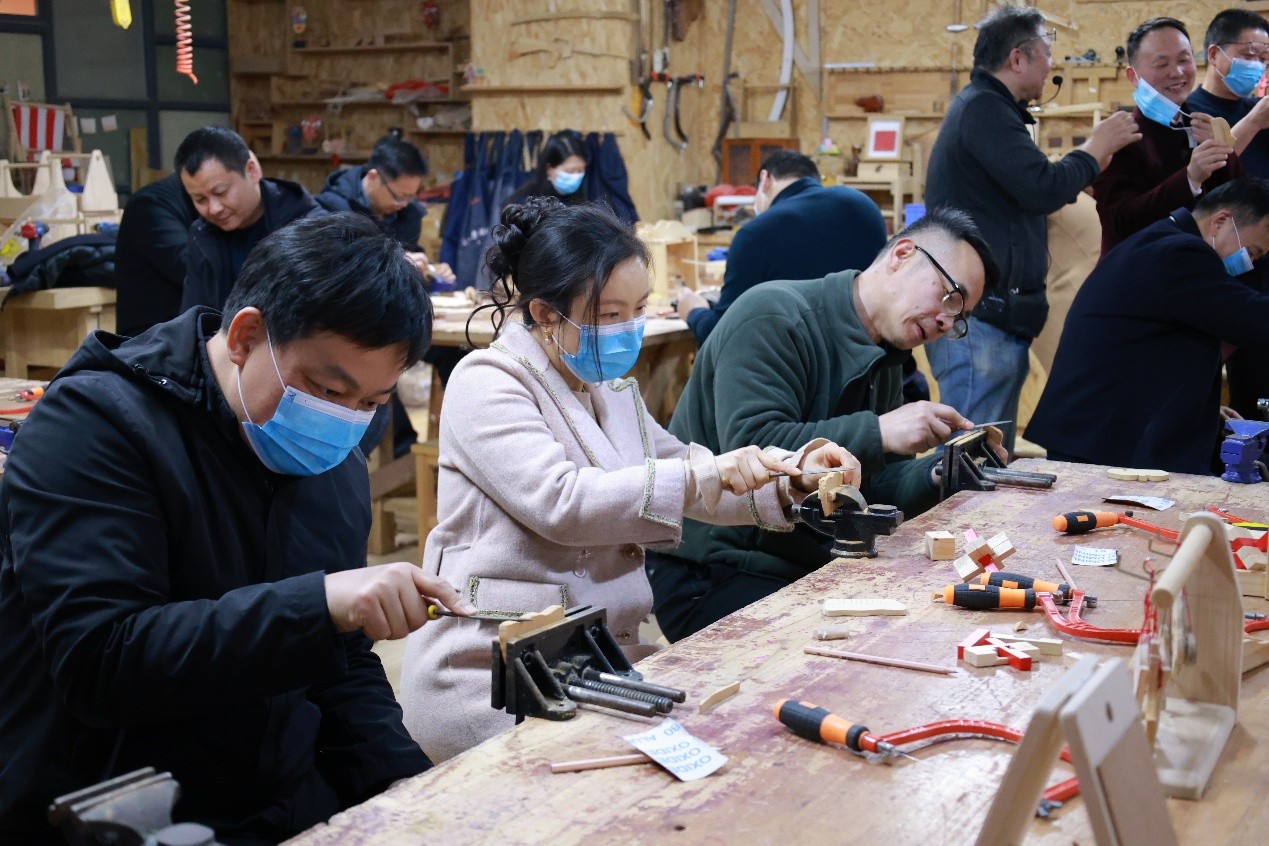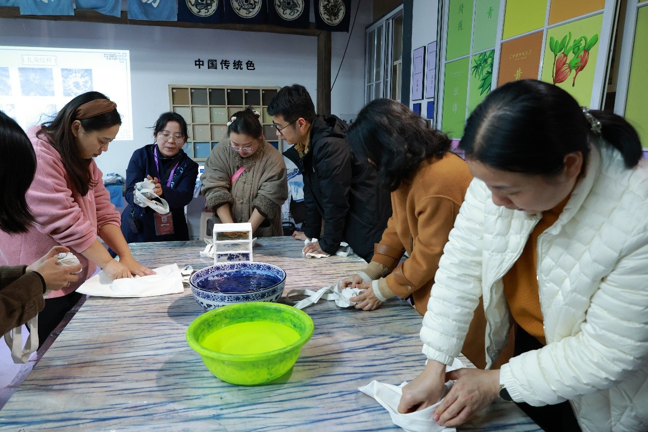 在讲解员的引导下,中心组成员与统战代表共同参观非遗馆主展厅、古法榨油坊、泥书技艺等展区。在实践体验环节,成员们分两组参与木工制作与古法扎染。中心组(扩大)成员翦象慧在木工制作中感慨道:“各民族文化的交融共生在非遗技艺中得以彰显。活动不仅增进了团结,更让我们对铸牢中华民族共同体意识有了更深理解。”无党派人士谢曹红在扎染体验中表示:“亲手创作的过程让我体会到非遗技艺的精髓。这种沉浸式学习方式,让中心组理论与统战实践有机结合,真正实现了‘学用相长’。”