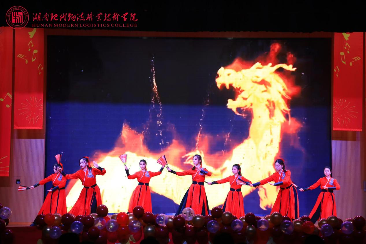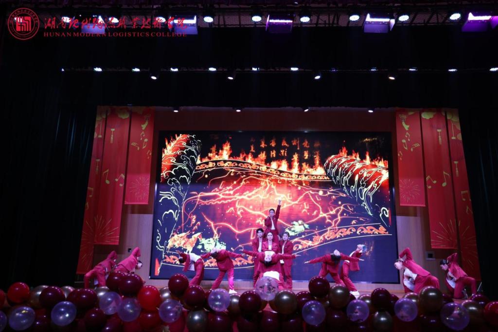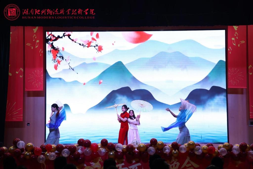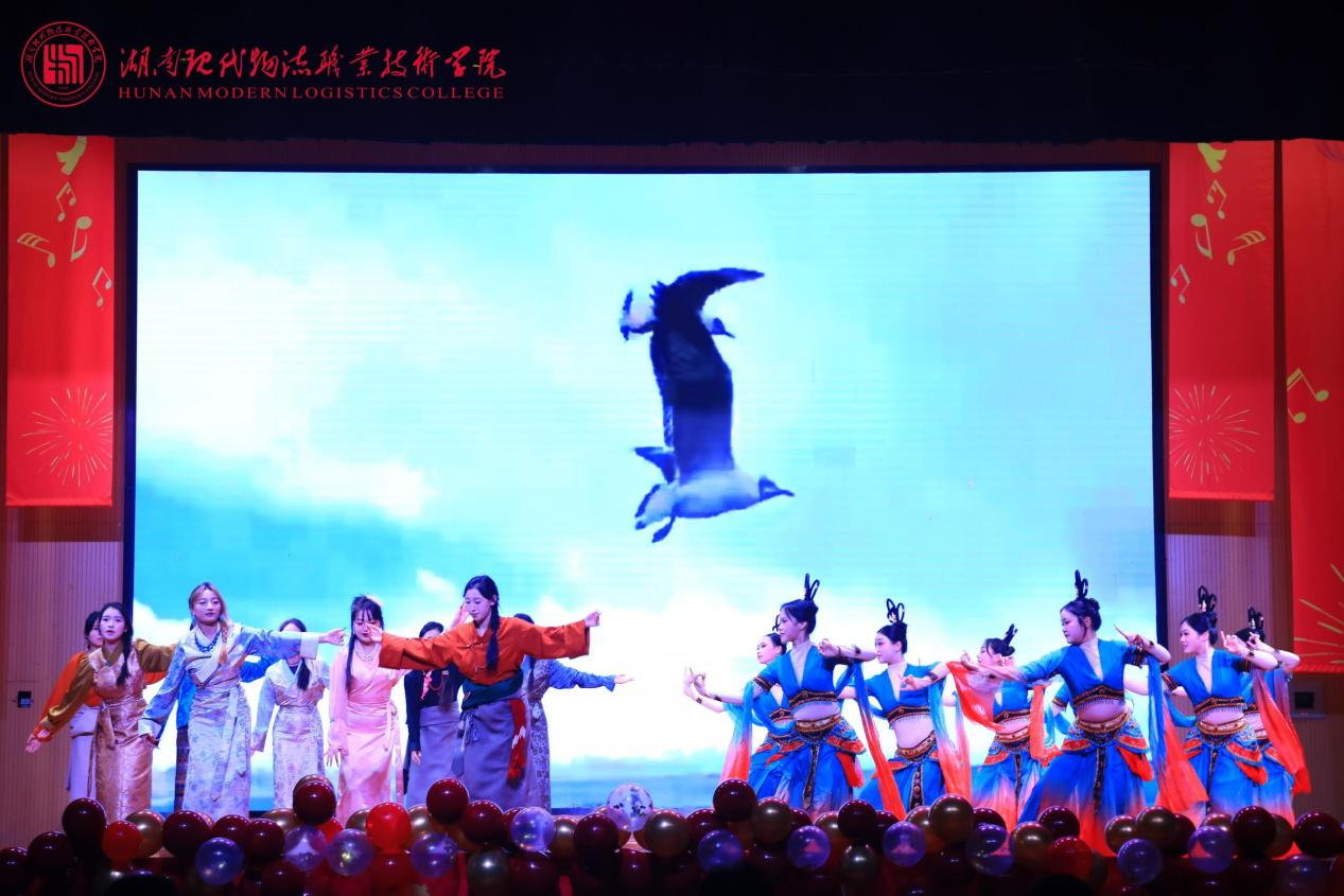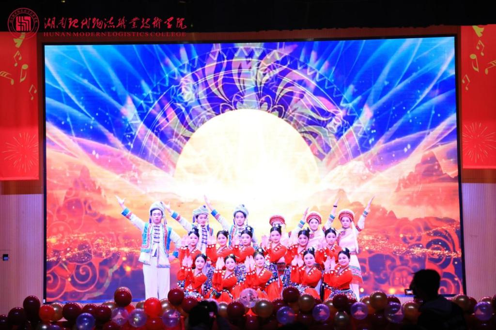 第三篇章“新元启序·共赴荣光”凝聚奋进力量。声乐艺术协会合唱《少年向荣光》,歌声嘹亮、意气风发,传递出少年当有为的赤诚;团委舞蹈《飞天·踏云》惊艳亮相,敦煌舞的飘逸灵动与藏族舞的豪迈奔放完美交融,尽显中华多民族文化魅力,赢得满堂喝彩;工会选送的师生朗诵《诗词里的中国》声情并茂,带领师生在诗词长河中感悟中华文脉;物流信息学院师生带来《相亲相爱·共启新元》,温情歌声传递出全校师生同心同行的深厚情谊,晚会在温馨氛围中圆满落幕。