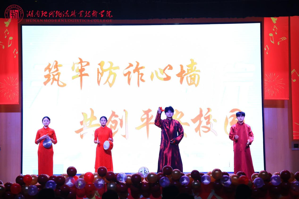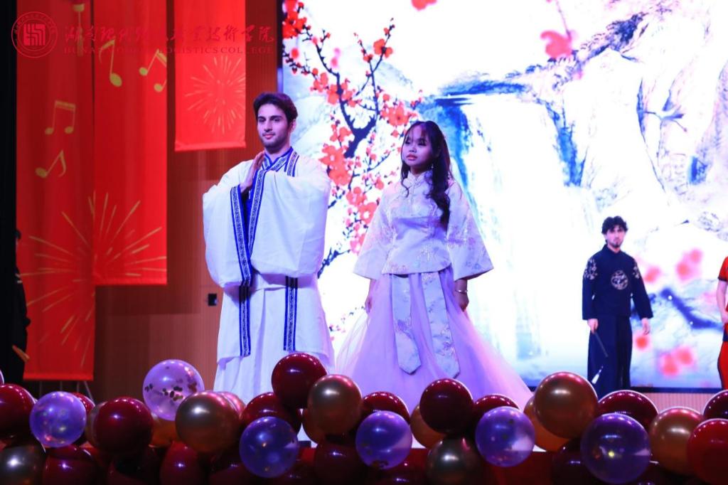 第一篇章“薪火承韵·岁华如歌”尽显文化底蕴。国际物流学院古典舞《青瓷墨韵》衣袂翩跹,让留学生沉浸式感受汉服婉约之美;保卫部三句半《无诈物院——薪火传诚·反诈同行》以方言笑料包裹反诈知识,当“陌生链接别乱点”的包袱引发全场呼应,安全理念在欢声笑语中深入人心;德风国学社、美妆协会与动漫协会联袂呈现的《雪韵风华秀》打破次元壁垒,汉服云肩与二次元裙摆创意同框,来自塔吉克斯坦、印度尼西亚等五国留学生身着汉服执团扇款款走秀,让传统文化从课本走向生活,鲜活又亲切。