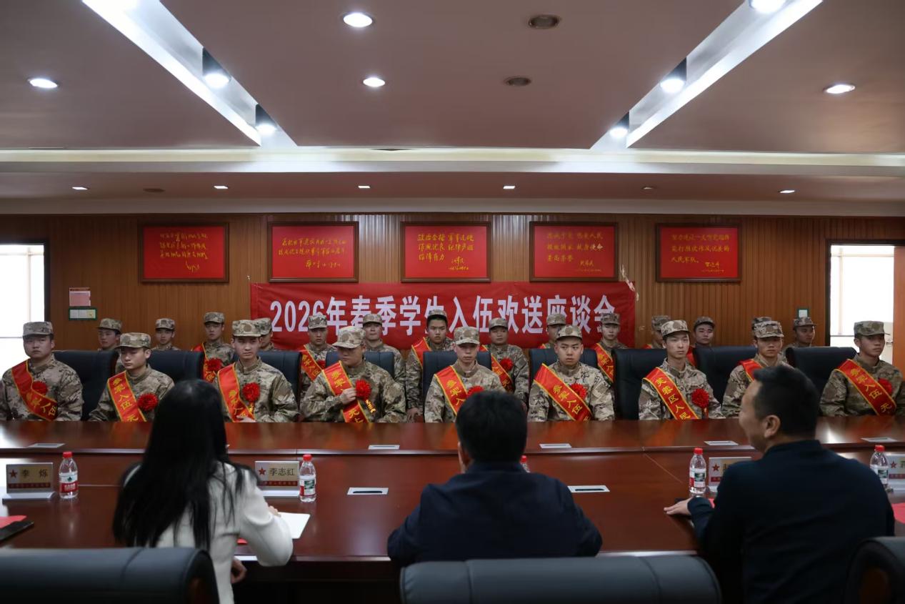 戎装赴征程,热血铸忠诚。3月13日下午,我校在芙蓉区人民武装部举行2026年春季学生入伍欢送座谈会。学校党委委员、副校长肖勇,学生工作部(武装部)部长赵建军、各二级学院党总支书记与即将奔赴军营、献身国防的优秀学子齐聚一堂,为他们送上母校最真挚的祝福与殷切的期望。