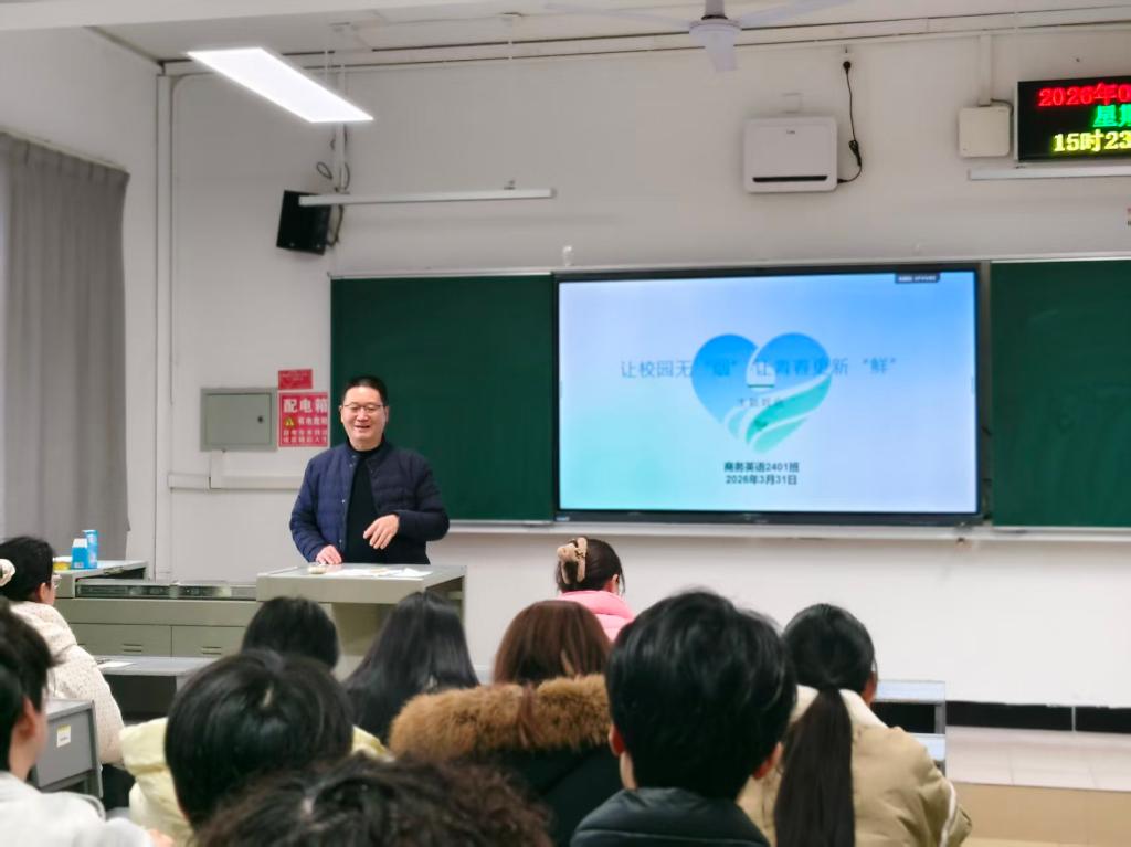 为深入落实学校无烟校园建设工作部署,引导学生树立健康生活理念,3月31日,国际物流学院商务英语2401班“让校园无‘烟’·让青春更新‘鲜’”主题班会在教学楼如期举行。班级联系领导学校党委委员、纪委书记刘贵书、辅导员李兰共同参加班会。