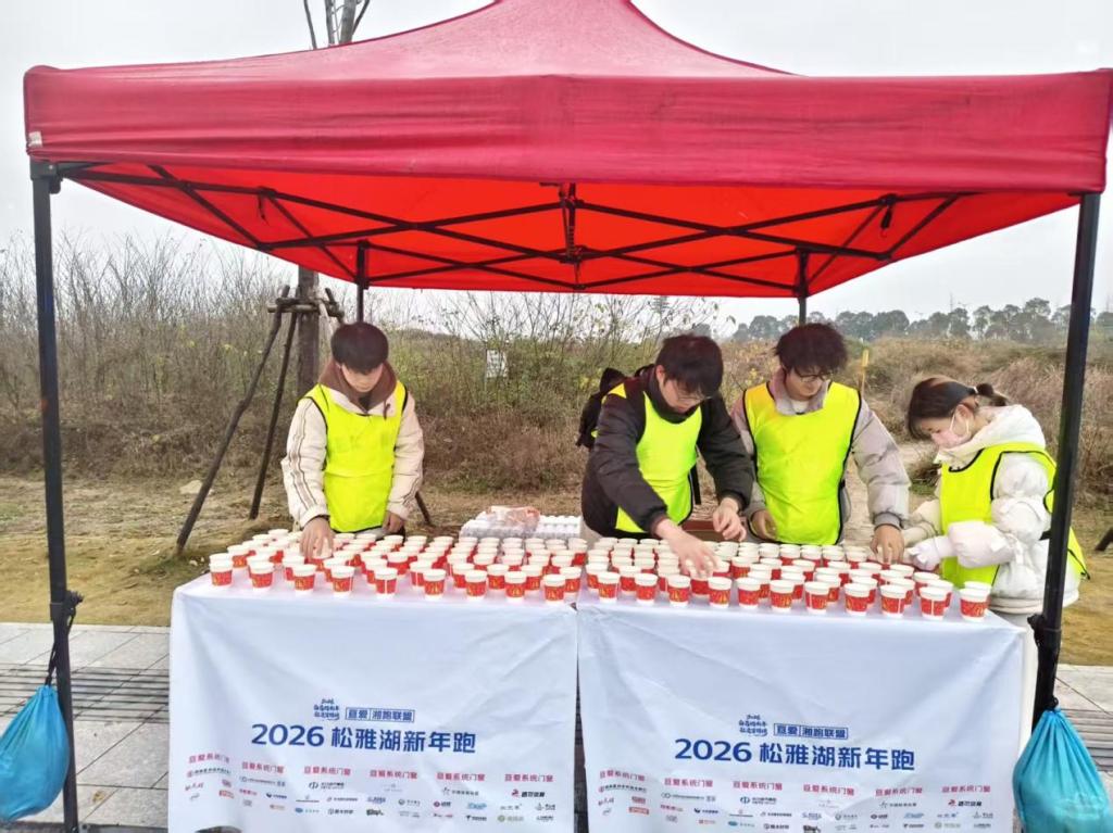 比赛当天清晨,天色未亮,寒意尚浓,志愿者们已准时集结,统一乘车奔赴各服务站点,迅速进入工作状态。他们细致清点各类物资,将功能饮料、能量胶等补给品整齐码放,确保参赛选手能便捷、快速获取补给。亲子跑终点站的11名志愿者,以温情服务筑牢暖心防线——他们耐心引导完赛家庭领取纪念物资,温柔安抚年幼选手的情绪,用细致入微的关怀,让亲子跑充满温馨氛围。补水站的志愿者们化身“能量传递员”,不仅精准递上补给,更用嘹亮的呐喊传递力量——“加油,坚持住!”“新年快乐!”一句句温暖的鼓励、一个个坚定的眼神,驱散了选手的疲惫,让奔跑之路满是暖意。赛道补给站的志愿者们分点驻守、协同联动,在赛道关键节点搭建起坚实的“能量加油站”,及时为选手补充能量;计时点志愿者全神贯注紧盯冲线瞬间,精准记录大众组前十名选手的过线顺序,确保名次统计公平公正、准确无误;医疗站志愿者严阵以待,熟练掌握应急处置流程,随时准备为身体不适的选手提供帮助,为跑者的健康安全筑牢“防护网”。赛事落幕后,志愿者们丝毫未松懈,主动开展垃圾分类与场地清洁工作,用心守护松雅湖的水清岸绿,用实际行动践行环保理念。