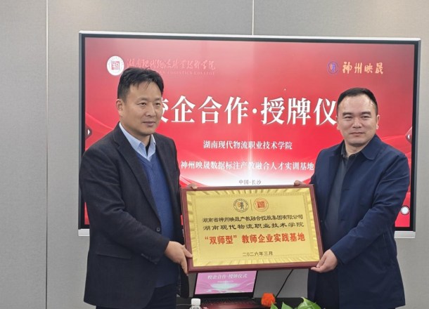 为深化产教融合、促进学生高质量就业,3月25日下午,在湖南现代物流职业技术学院党委书记龙吟的带领下,党委委员、副校长肖勇,物流信息学院院长翦象慧,校企合作与招生就业处处长李乐、副处长彭涛,人工智能技术应用专业带头人杨曙一行,赴长沙市国家数据标注产教融合示范基地,与湖南省神州映晟产教融合控股集团有限公司总经理吴名为等企业代表开展校企合作交流会,并举行“实习就业基地”和“双师型”教师企业实践基地授牌仪式。