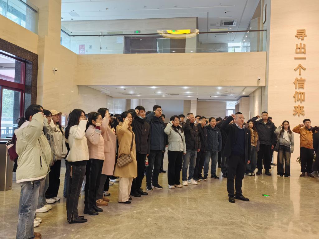 “我志愿加入中国共产党……”在杨开慧烈士汉白玉雕像前,学院党总支书记蒋兴君带领全体党员整齐列队,面向党旗庄严伫立、高举右拳,重温入党誓词。铿锵有力的誓言回荡在馆内,与窗外淅沥雨声相融,声声叩问初心、句句凝聚信仰,让全体人员在沉浸式氛围中感悟精神力量、牢记使命担当。
