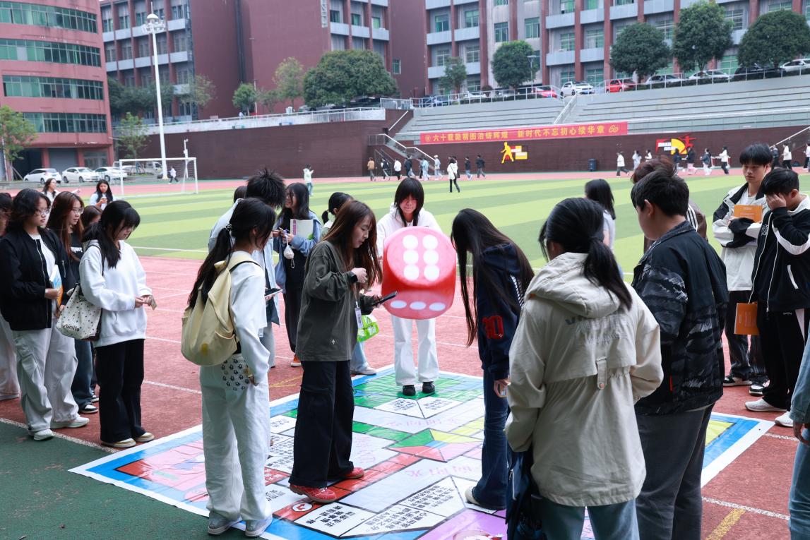 教学楼前坪的“情绪飞行棋”站点以“2~4人组队”模式展开。活动开始前,所有棋子置于“Start”位置,队员轮流掷骰子,按点数在棋布上移动,每停留在一个格子,需完成对应心理任务——或“说出自己的三个优势”,或“分享一个近期解压方式”,或“给身边队友一个鼓励的拥抱”。完成任务即可停留前进,未完成则退回原点,最终走到终点的小组,每位成员均可额外获得一枚印章。师生们在欢笑中敞开心扉,在协作中正视情绪,现场氛围轻松而热烈。