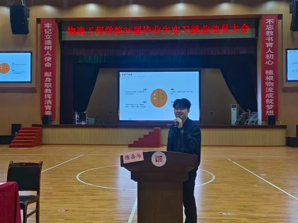 11月17日,物流工程学院顺利举行2026届就业实习动员大会。大会特邀工程物流专业2202班优秀毕业生陈岳与同学返校,为全体2026届毕业生带来了一场题为《从校园到职场:成长轨迹与避坑指南》的就业故事分享。