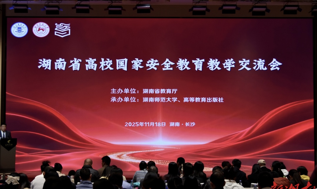 11月18日,湖南省高校国家安全教育教学交流会在长沙顺利举行。会议由湖南省教育厅主办,湖南师范大学与高等教育出版社联合承办,来自全省107所高校的220余名教师代表齐聚一堂,共商国家安全教育发展大计。我校通识学院院长沈鹏、副院长赖永晖及教师童清华、张辅云应邀参会。