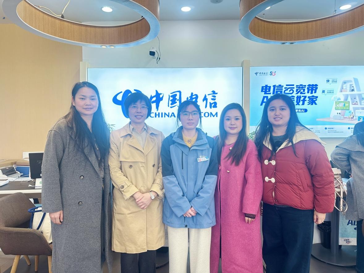 随后,学院一行来到中国电信永州分公司金水湾营业厅,看望在岗工作的会计2203班毕业生蒋婷。营业厅负责人对蒋婷的专业能力和工作表现给予高度评价,并介绍了企业近年来对财经类人才的岗位需求与能力要求。老师们详细询问了蒋婷在岗位适应、职业认知等方面的情况,鼓励她积极融入企业环境,夯实业务基础。
