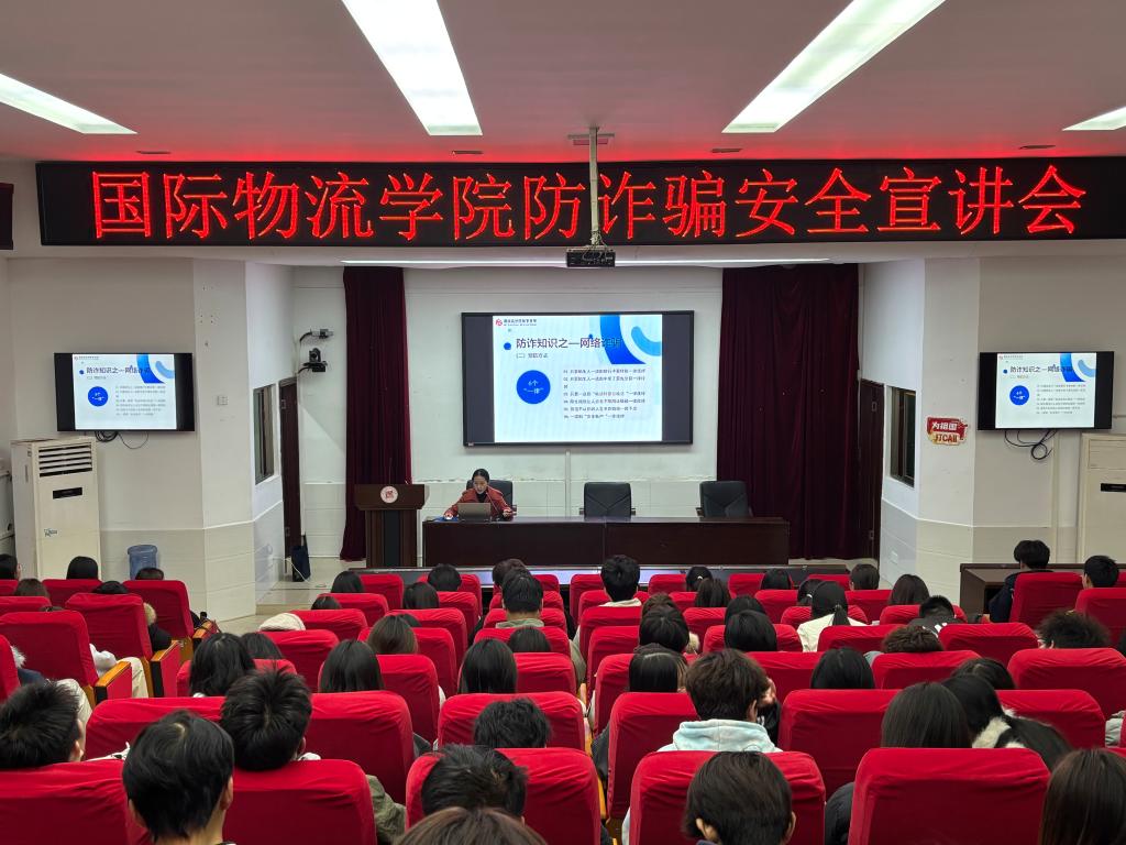 为切实提升高校学生的反诈防骗意识和自我保护能力,有效遏制校园电信网络诈骗案件高发态势,11月25日,由学校与属地社区星悦社区联合开展的防诈骗安全宣传会在图书馆一楼学术报告厅顺利进行,本次活动邀请了星悦社区以及湖南高泽律师事务所宣讲团进行宣讲,参加本次活动的有国际物流学院全体专兼职辅导员以及24级、25级各班学生代表。