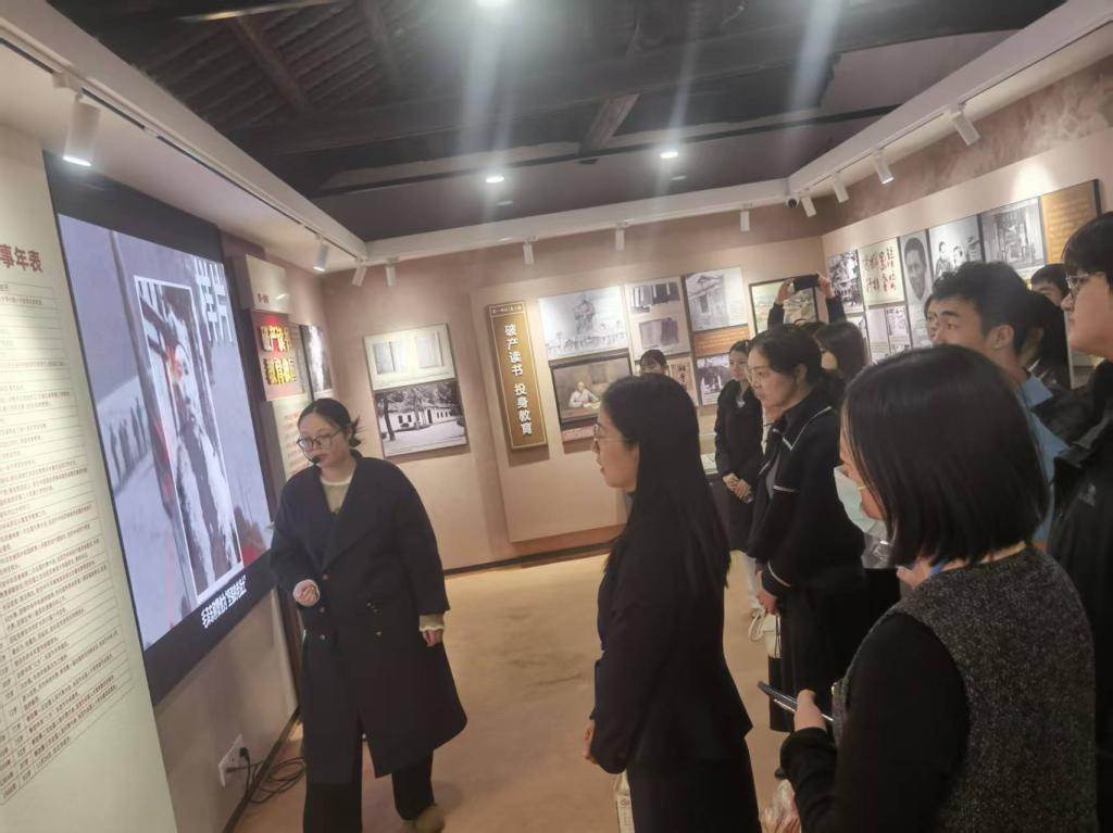 研学团队在讲解员的引导下,先后参观了徐特立先生生平事迹陈列馆与故居旧址。泛黄的手稿、珍贵的历史图片、复原的生活场景,生动再现了徐特立先生从乡村教师到革命教育家的光辉历程:从“毁家兴学”创办新式学堂惠及贫苦子弟,到不惑之年赴法勤工俭学探寻救国真理;从大革命失败后毅然入党投身革命洪流,到57岁高龄参加长征坚守教育阵地;从苏区扫盲运动的开拓者到党的第一所理工科大学的奠基人,每一个事迹都令在场师生深受震撼。大家不时驻足凝视、交流感悟,深刻体会到徐特立先生“以教救国”的赤子情怀与“一辈子革命、一辈子教书”的责任担当。