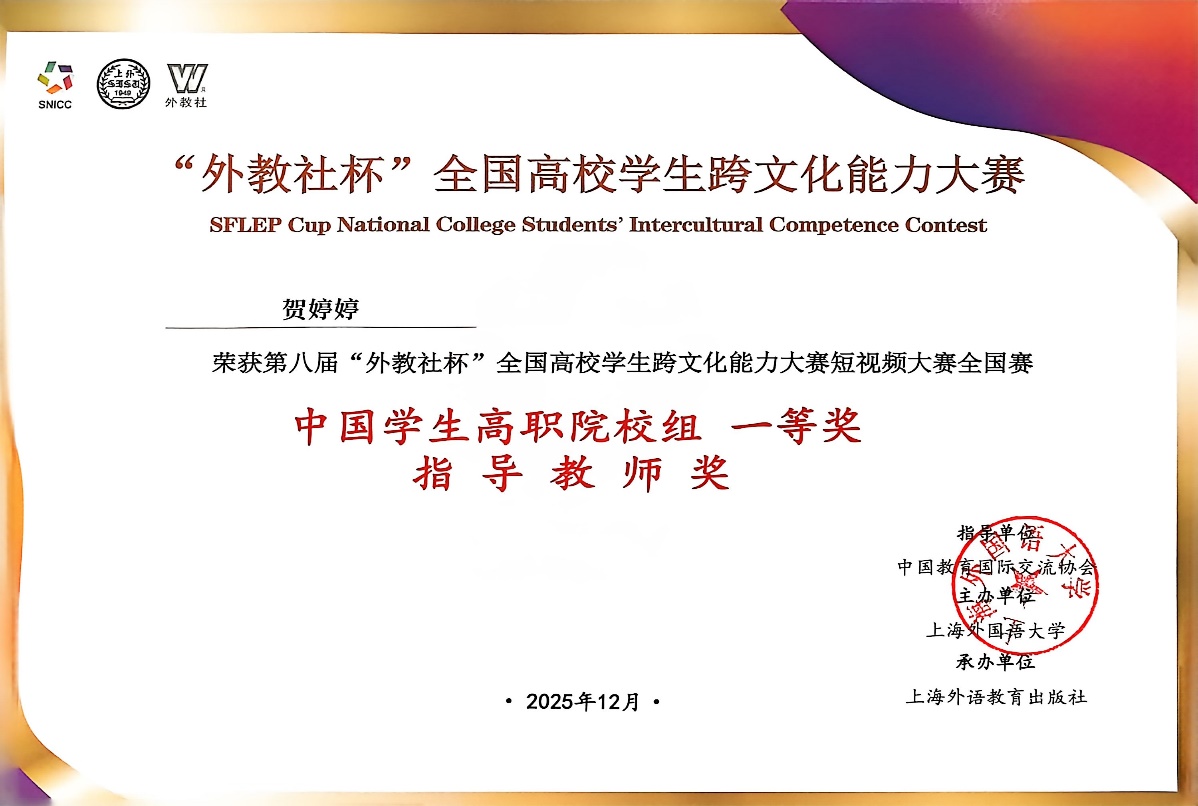 此次获得全国奖项,是我校持续推进国际化人才培养、着力提升学生跨文化交际能力的又一重要成果。学校始终致力于将跨文化交际能力培育融入专业教学与实践环节,积极搭建“以赛促学、以文化人”的育人平台,鼓励学生立足专业、根植文化、面向世界,用国际化叙事讲好中国故事。未来,学校将继续深化教育教学改革,拓展国际交流载体,培养更多具有家国情怀、全球视野与卓越跨文化沟通能力的高素质技能人才。