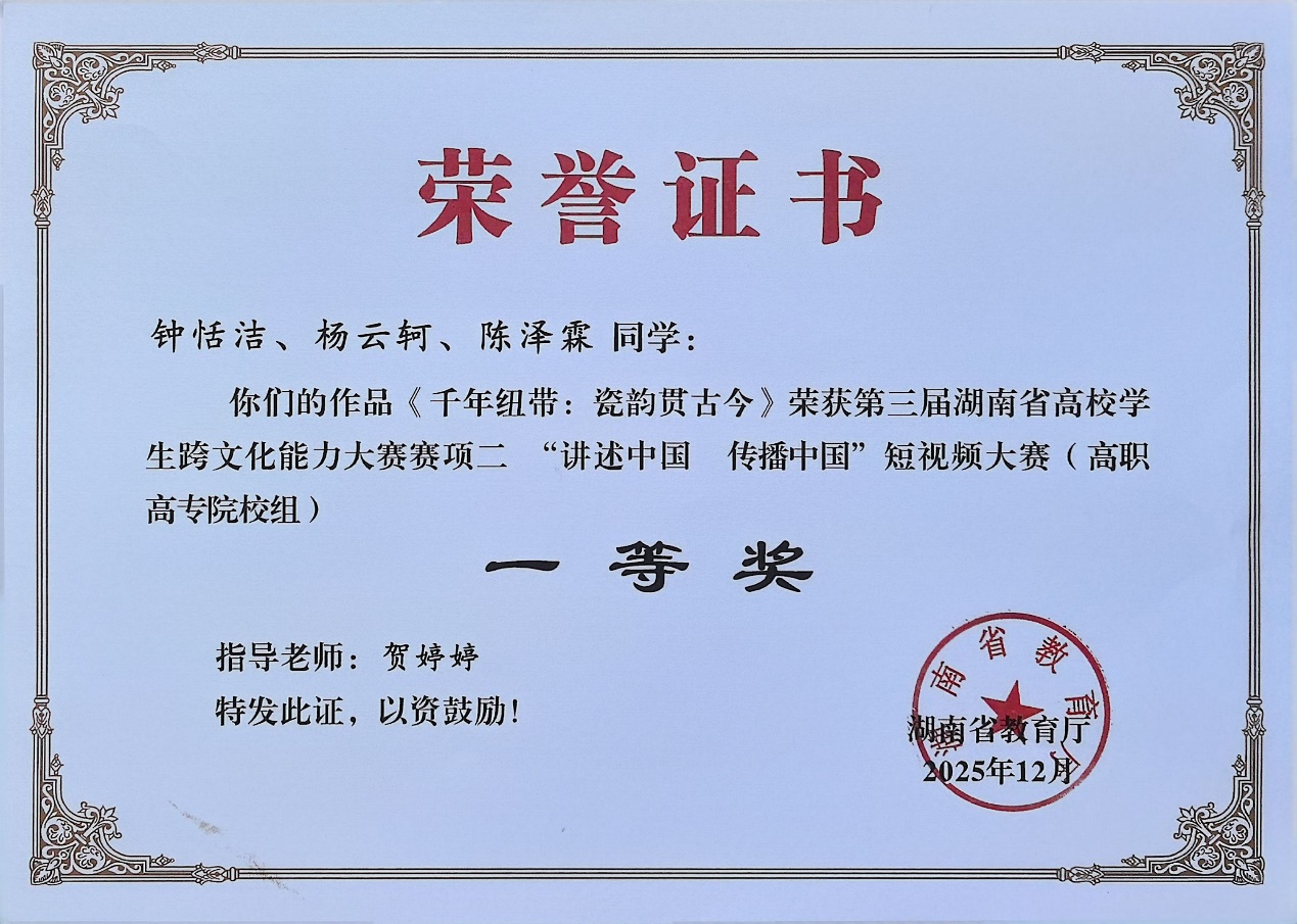 在近期结束的第八届“外教社杯”全国高校学生跨文化能力大赛“讲述中国 传播中国”短视频大赛全国总决赛中,由我校贺婷婷老师指导,钟恬洁、杨云轲、陈泽霖同学参赛的作品《千年纽带:瓷韵贯古今》历经层层选拔,从全国各赛区2500余件作品中脱颖而出,最终荣获中国学生高职院校组全国一等奖。