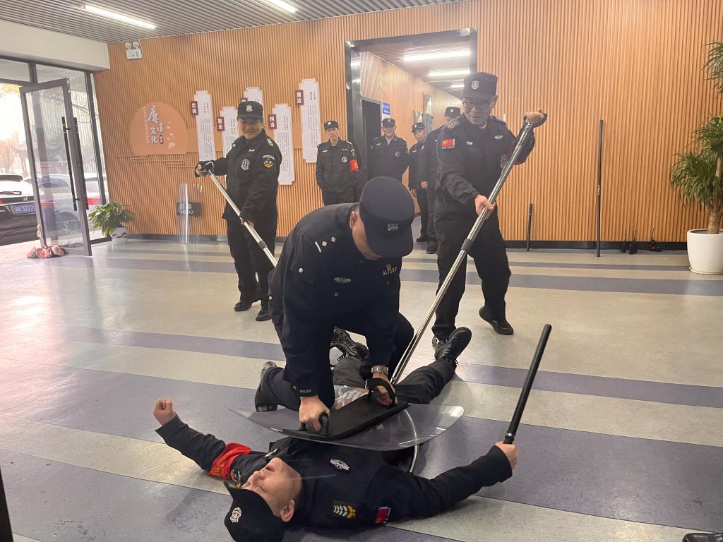 在集体演练环节,安保队伍演练模拟不法人员持械强闯校园的突发场景。监控室安保发现险情后,立即启动校园反恐防暴应急预案、触发一键报警系统,同步呼叫巡逻安保支援。现场安保人员沉着应对,迅速持防暴器械拦截牵制,支援力量快速集结,按照战术要求组成防暴队形,密切协同、果断处置,成功将“暴徒”合围制服。整个流程指令清晰、分工明确、配合默契,充分检验了预案的可行性与安保队伍的实战能力。