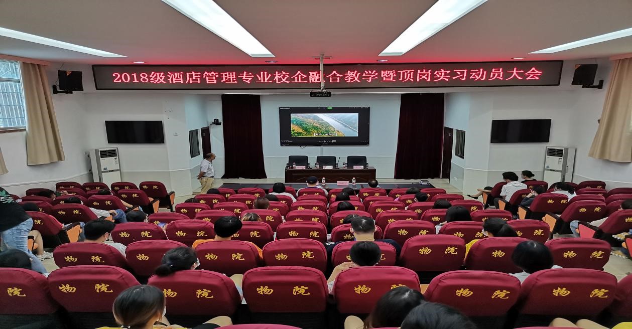 6月12日上午,物流人文艺术学院组织18级酒店管理专业全体同学召开了校企融合教学暨顶岗实习动员大会。圣爵菲斯大酒店人力资源部总监方敏、院长刘淑一、总支书记李烁、体育部部长唐彪、酒店管理专业带头人石通和、综合干事汤愿、学生干事刘富建和辅导员左宛鑫等出席此次大会。会议由副院长姚济国主持。