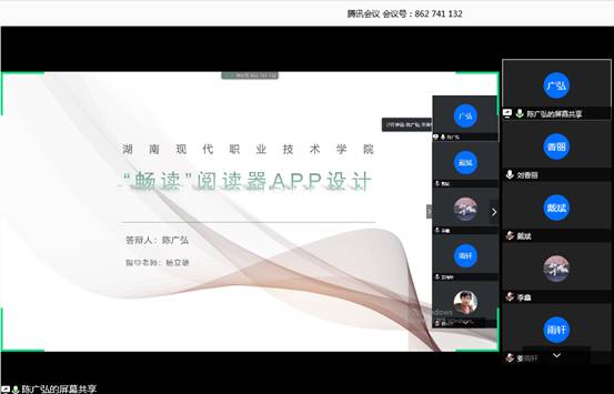 这次网络答辩,采用腾讯会议系统分2个会议室同时进行,有66位同学参加。答辩包括线上PPT陈述、作品演示、和师生答辩三个环节。答辩委员会老师针对学生的毕业设计提出新的意见和建议。整个答辩都做了录屏、截屏,并作为答辩记录留存。答辩结束后,各组答辩秘书把答辩委员会老师的问题和建议反馈给指导老师,及时进行反思和整改,确保2020届计应专业和移动应用开发专业毕业生毕业设计后续工作的顺利进行。