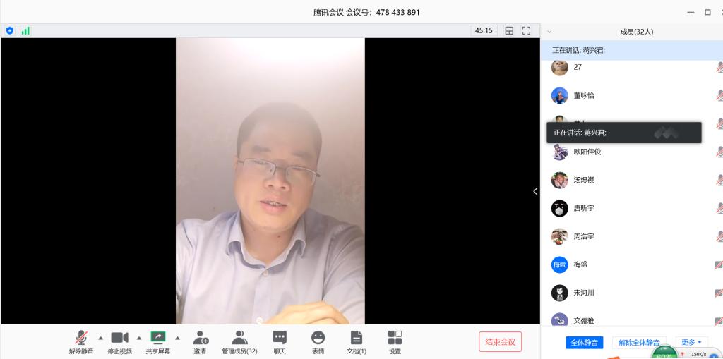 学院副院长蒋兴君发言指出,疫情期间我们用腾讯会议召开线上专题会,创新了会议形式,延伸了育人阵地,拓展了育人空间,学校和学院领导,老师们齐上阵,充分展示了学院在疫情期间对毕业班工作的高度重视,齐抓共管,形成育人合力。他同时对同学们提出了四点要求和建议:一是提高认识,严格要求自己,进一步做好居家学习和锻炼,养成良好的学习和行为习惯,增强自律自觉。居家期间多跟父母沟通,多分担家务,学会感恩。二是要创新方法,积极行动,进一步落实学院《加强疫情期间学生思想教育,创新学生活动形式,引导学生做最美青春逆行者和宣传员》的文件要求,争做疫情期间的最美逆行者,做好防疫优秀事迹推广宣传,鼓励大家通过文字、视频等形式记录疫情期间的生活和学习,讲好国际合作与继续教育学院自己最美的故事。三是提前准备,严格规范,做好开学返校和防疫等各项工作。积极落实国家卫健委和教育部发布《大专院校新冠肺炎疫情防控技术方案》文件要求,注意身体,加强锻炼,在收到学校返校通知前继续安心居家,做好在线学习,返校前准备充足的防疫物资,返校途中佩戴好口罩,少与他人接触,勤洗手,做好个人防护。四是不忘初心,坚定信心,做好出国、专升本、毕业设计、征兵、就业等工作。作为中德班的学生,鼓励大家坚定出国信念,走出国门,拓展视野完成自己留学深造的梦想。面对不同人生选择,要学会权衡利弊,做好人生规划。