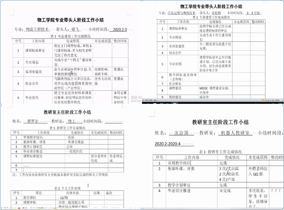 会议分两个阶段。第一阶段由院长梁飞主持。重点围绕2、3月份进行工作总结盘点,并研究下一阶段工作。各教研室主任、专业带头人、行管人员就个人承担的主要工作进行书面汇报,每位老师认真总结前段时间的完成情况,对未完成的工作提出了整改时间。接着,副院长伍瑛就学院开学至今的常规教学工作督查情况进行了通报,对课程标准建设、毕业设计工作的推进情况进行了小结。