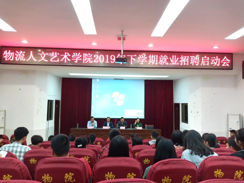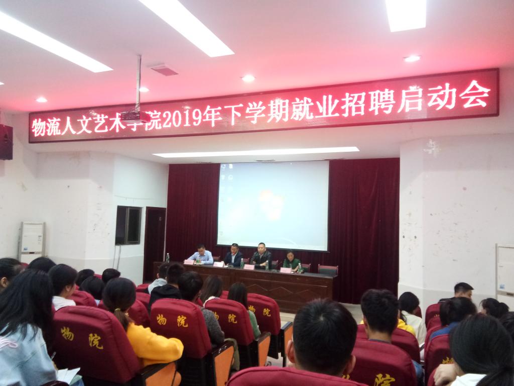 2019年11月4号晚,物流人文艺术学院在学术报告厅召开了2019年下学期就业招聘启动会,此次到会的领导有学院校企合作与就业处处长赵建军,物流人文艺术学院党总支书记、院长刘淑一,党总支副书记、副院长蒋兴君以及企业代表庞正山。2017级毕业班学生参与此次启动会。会议由蒋兴君副院长主持。