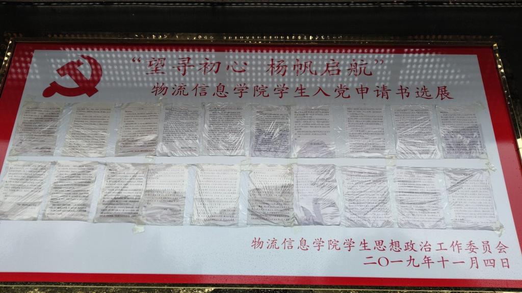 2019年11月4日,物信学院学生思想政治工作委员在我校宣传栏进行学生入党申请书选展活动。此次活动的主题是“望寻初心,杨帆起航”,是物信学院师生联合支部主题教育系列活动之一。
