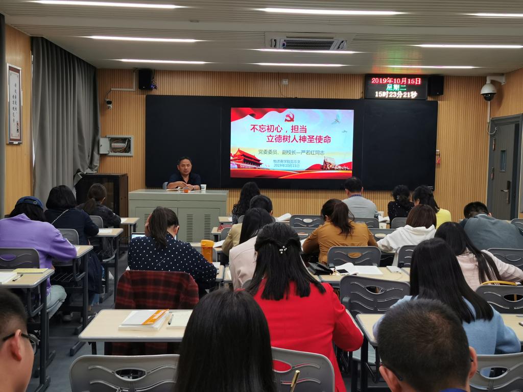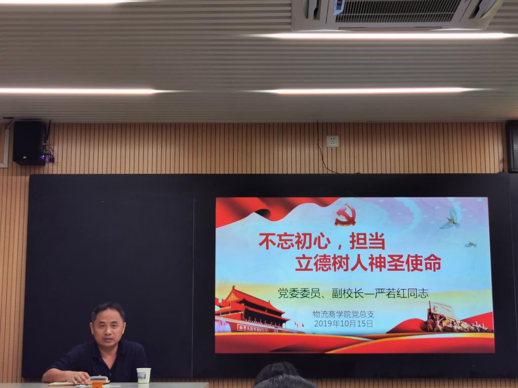 2019年10月15日下午,物流商学院党总支在教学楼111教室召开党员大会。学校党委委员、副校长严若红同志面向物流商学院全体教职工党员及学生党员上党课,党课主题为“不忘初心 担当立德树人神圣使命”。
