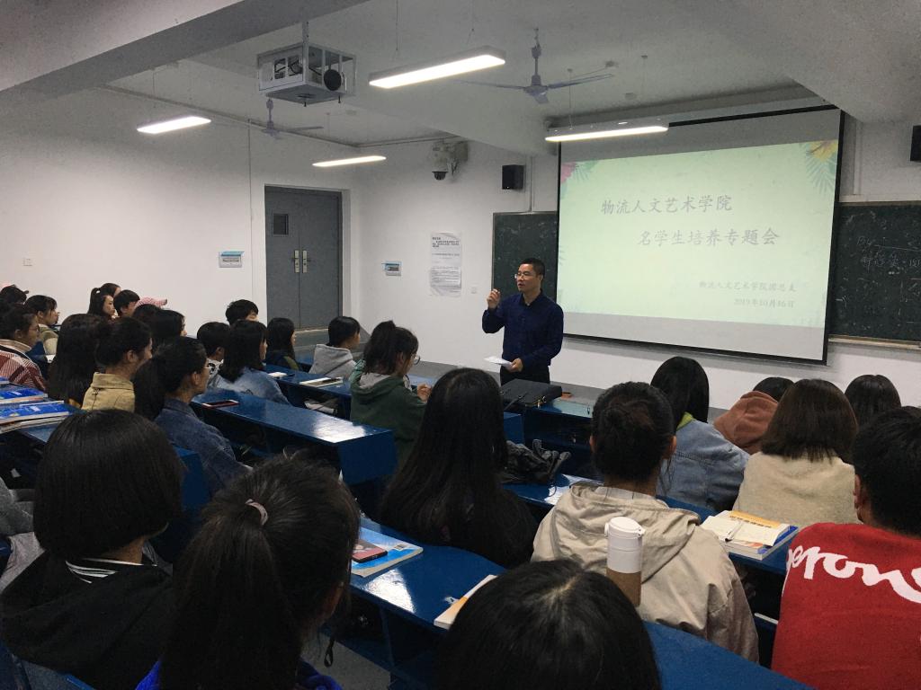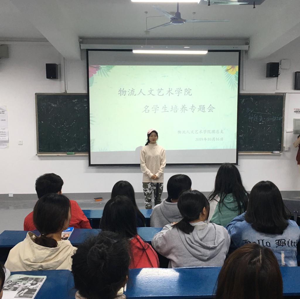 2019年10月16日晚7::00,物流人文艺术学院在教学楼300教室召开“名学生”培养专题会,出席本次会议的领导老师有物流人文艺术学院党总支副书记、副院长蒋兴君,团总支书记龚韵洁,学院“文体类”名学生及2019级计划纳入名学生培养的新生。