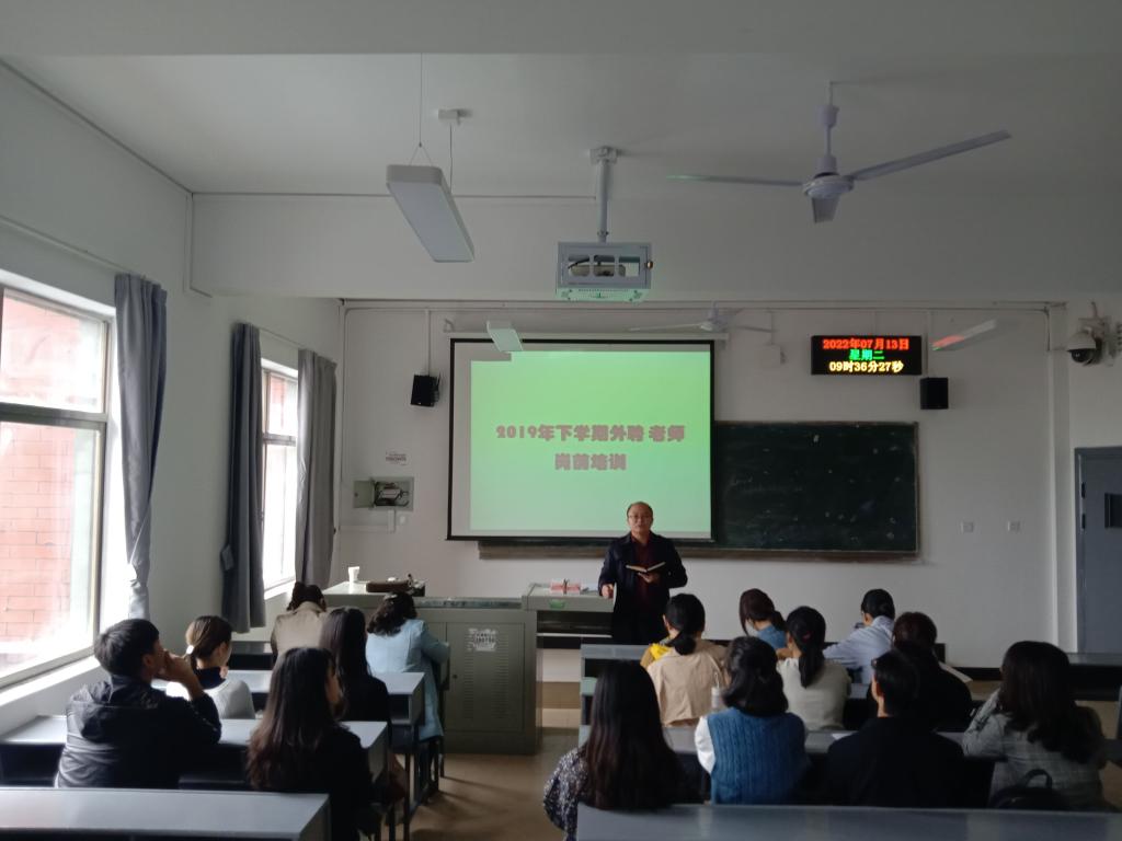 试讲合格的教师随后在103教室由物流人文艺术学院主管教学副院长姚济国老师对拟聘的外聘老师开展岗前培训。首先组织大家学习了学校教学相关文件,并就其重点内容向各位老师进行了详细讲解与说明,重点强调了7个方面:上课的教学资料要求(ppt、教学设计、考勤表、教材)、教学纪律要求(上课时间、调、停课程序、教学语言的使用)、教学设备与系统的使用、外聘老师薪酬标准说明、教研要求(要求外聘教师参加教研室集体备课)、紧急情况报告、处理程序、相关资质材料提供说明等。学习完这些文件,教务干事易文利老师就我校教务系统如何“打印学生点名册”进行现场演示,并下发本学期老师授课教材。