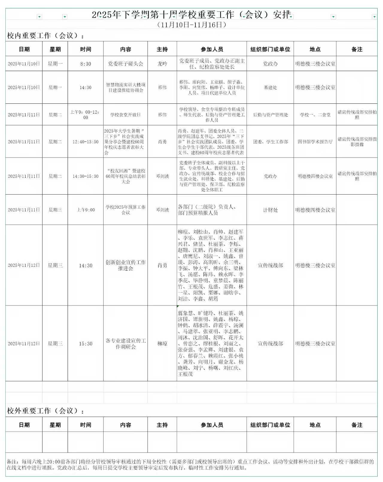 2025年下学期第十周学校重要工作(会议)安排