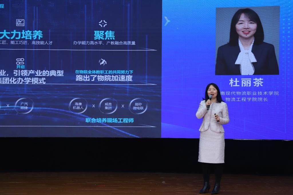 我校物流工程学院院长杜丽茶做《聚焦物流行业数智化,校企“联姻”共育现场工程师人才》分享汇报,分享内容从智能物流装备技术产业集群的顶层设计逻辑到校企共育工程师人才的培养方案创新,从与各龙头企业深入合作的模式到双元育人的可喜成绩,系统介绍了物工院响应智慧物流领域对AMR、AGV交付工程师的需求,优化调整物流产业智能化升级,推进物流工程技术专业工科化建设。通过整合龙头企业与该企业上下游企业资源,实现人才培养链和产业链的深度融合。